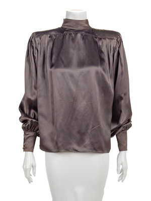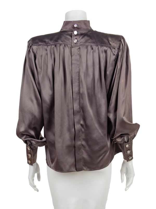 Silk satin blouse with stand collar, shoulder pads and long sleeves gathered into a wide buttoned cuff. The full body of the blouse is pleated into the shoulders. The bodice closes down the center back with covered buttons.