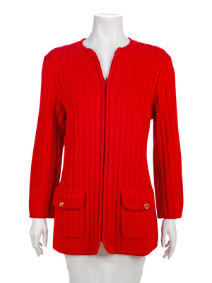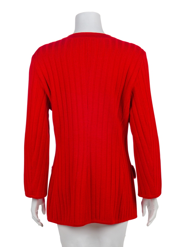 Red wool knit cardigan with a crew neckline, long sleeves, patch pockets with flaps and a center front zip closure. The pockets are closed with a goldtone and red enamel button with a 'V' in the center.