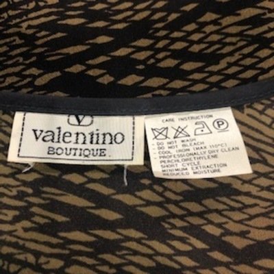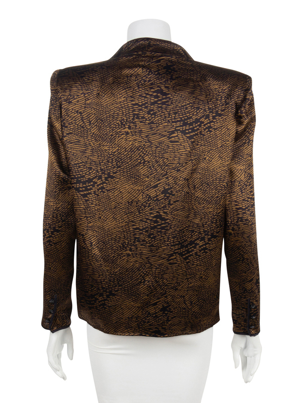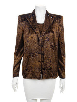Brown and black printed silk satin edged with black silk satin piping. Jacket has fold-back lapels secured with black buttons, long sleeves with a decorative three-button cuff and a center front button closure. The jacket has one inch shoulder pads. The blouse is cut in a slip-on tank style.