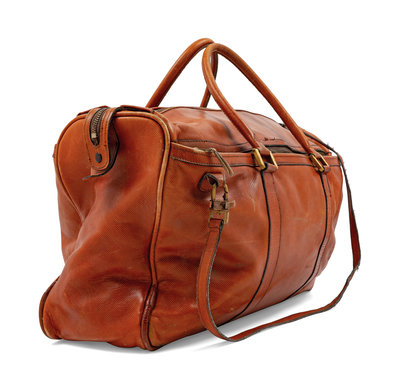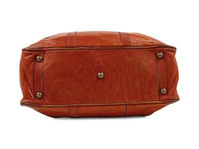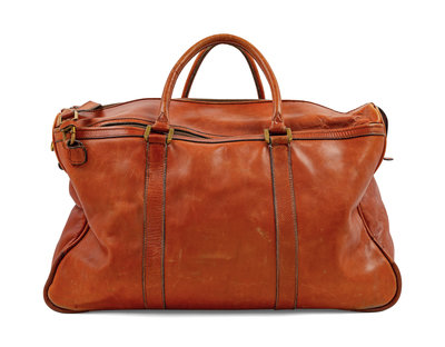 Brown leather duffel bag with goldtone hardware, front and back zip pockets, one center compartment with zip pocket, top zip closure with dual leather handles and a detachable flat leather shoulder strap.