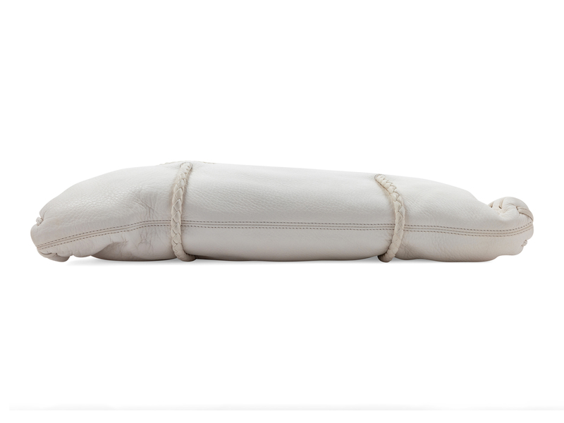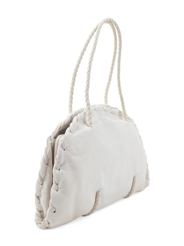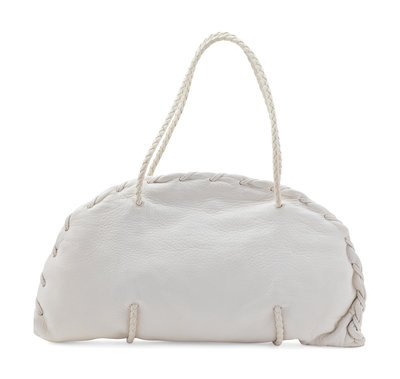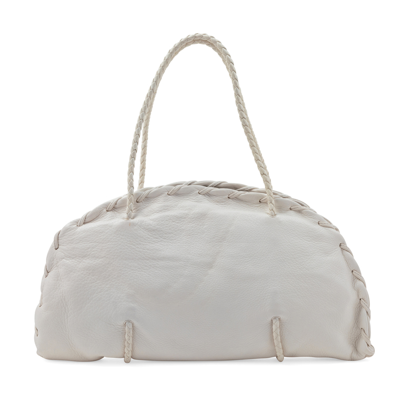 White leather with whip stitch trim, dual braided leather handles, and goldtone hardware, beige suede interior lining with three compartments; two open at top, the center framed with a push up button closure.