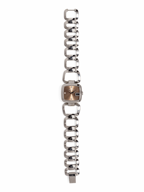 G shaped bezel, brown face with diamonds and silvertone hands, sapphire crystal, stainless steel link bracelet with fold over clasp with Gucci stamp.