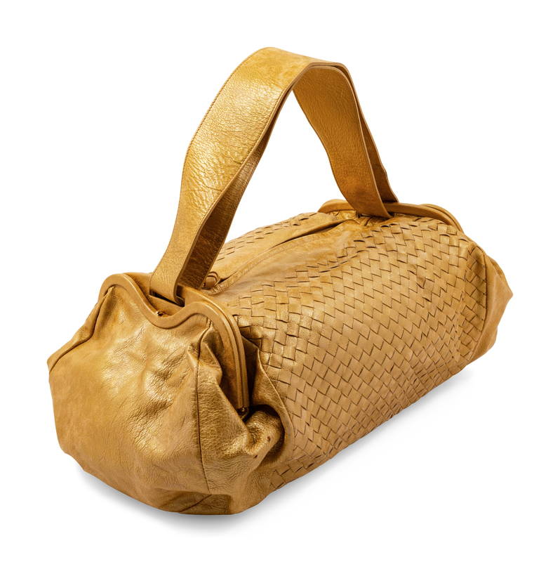 Marbled gold leather intrecciato with goldtone hardware and a wide flat shoulder strap, one central compartment with interior zip pocket and top zip closure, two end compartments framed with kiss-lock closures, beige suede interior lining. Together with a dustbag.