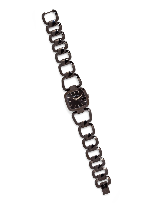 G shaped bezel, black face with silvertone hands, black stainless steel bracelet with fold over clasp with Gucci stamp.