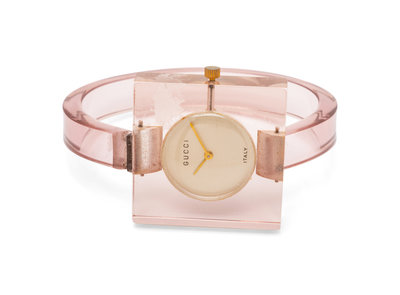 Clear purple lucite bracelet with a square bezel, silver face, goldtone hands and crown, clear back case, 17 jewels.