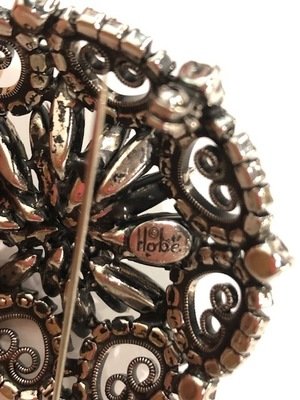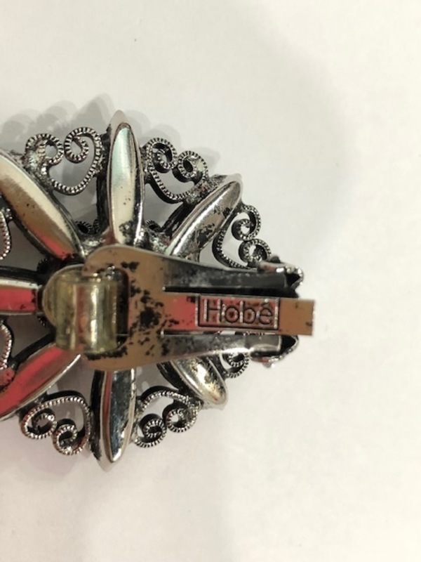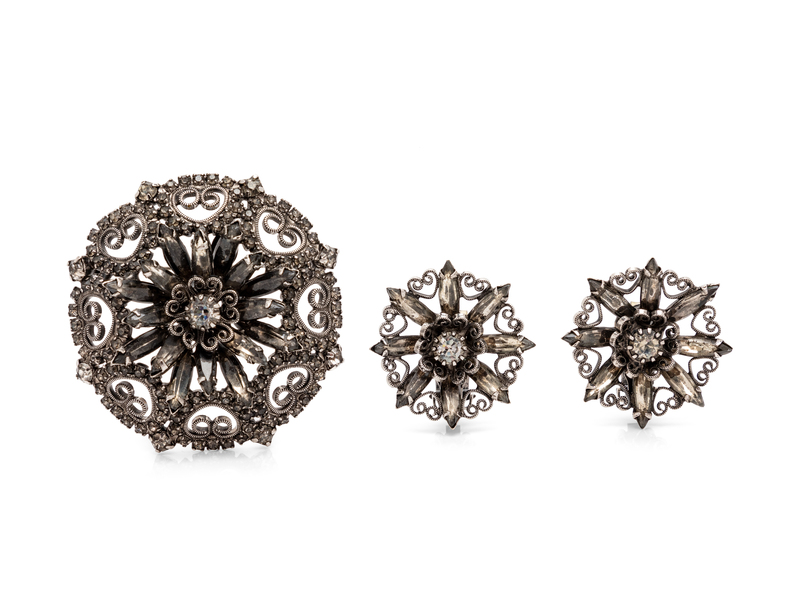 Gunmetal frame with black diamond rhinestones, the brooch has a back pin and safety clasp, measures: 2" x 2", the earclips measure: 1.25" x 1.25".