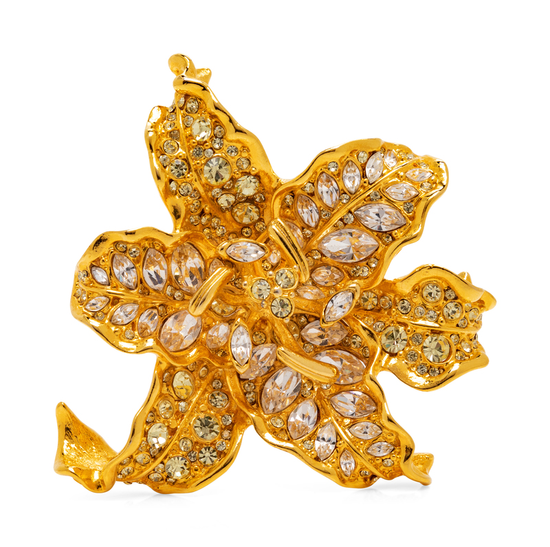 Flower-shaped goldtone brooch set with small rhinestones with a back pin and safety clasp.