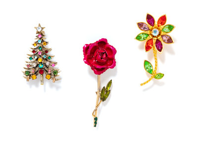 The first: Weiss goldtone rose brooch; length: 3.5" The second: Graziano goldtone flower with rhinestones brooch; length: 3". The third: Hollycraft Christmas tree with rhinestones, length: 2.5".