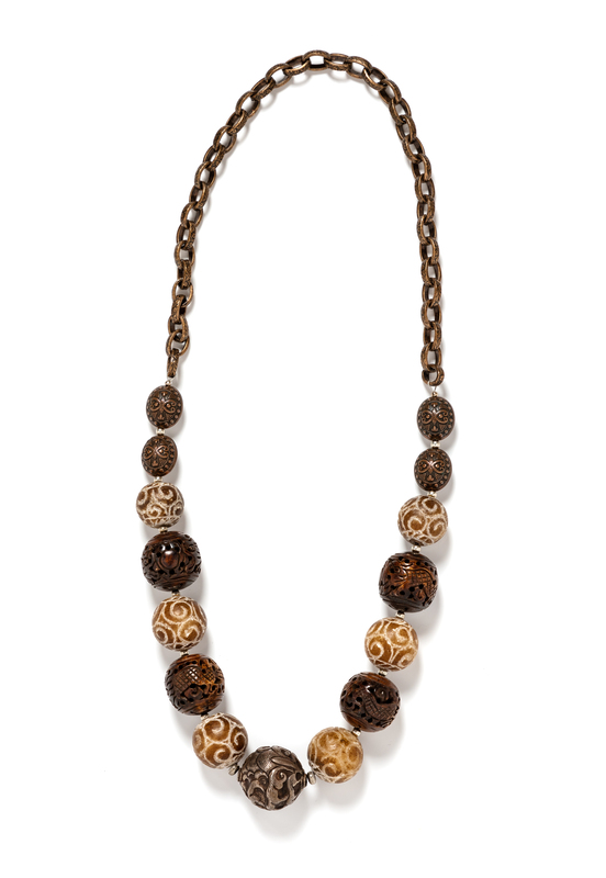 Eleven circles of carved or shaped metal or hard stone separated by a single small silvertone bead. These stones are connected with a goldtone chain stamped with a floral design. No claps.
