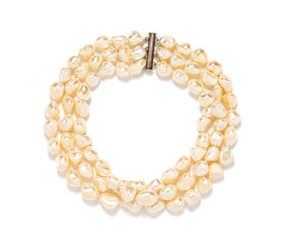 Three strands of faux pearls in irregular shapes attached to a sterling clasp.