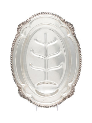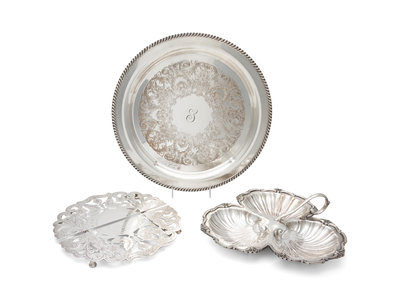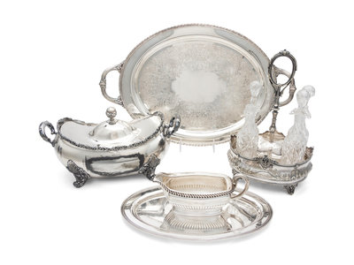 comprising two small sterling trays, a sterling creamer and sugar, a sterling bell, together with a group of silver-plate articles including a partial cruet set, a covered serving dish, a three-part shell form dish, 5 serving trays and a Tiffany silver soldered sauce boat.