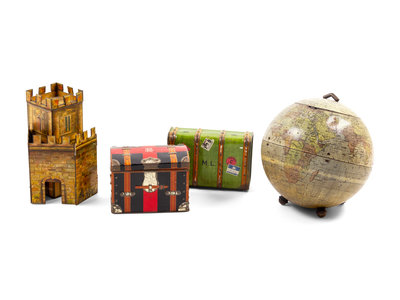comprising a castle form example, two suitcase form examples and a globe form example.
