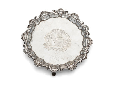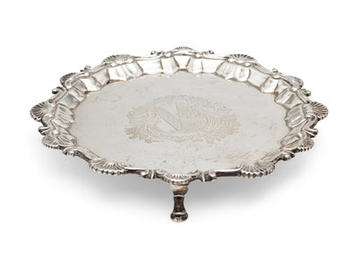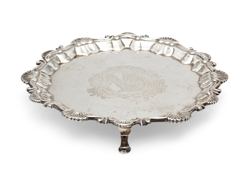 the rim decorated with scallop motifs and alternating C and S-scroll elements, the field centered by an engraved shield crest with foliate surrounds and raised on three pad feet.
