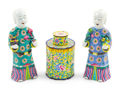 comprising a pair of figures and a canton enamel tea caddy.