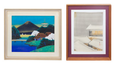 one depicting Mt. Fuji, the other snowy rooftops.