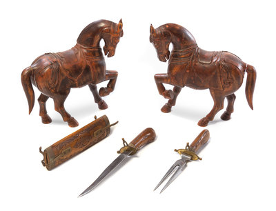 comprising a pair of wood horses, a carving set and a brass fixture.