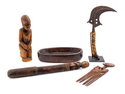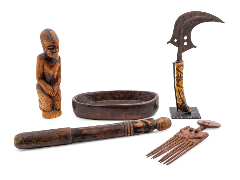 including a Magbetu ceremonial knife with a carved bone handle depicting two heads.