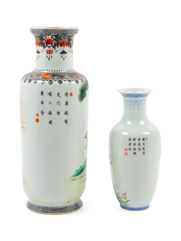 Two Chinese Famille Verte Porcelain Rouleau Vases
