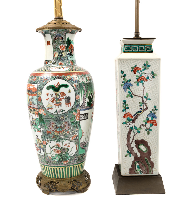 the first a baluster example painted with reserves enclosing figures in interior scenes. the second a square example decorated with prunus branches, each mounted as a lamp.