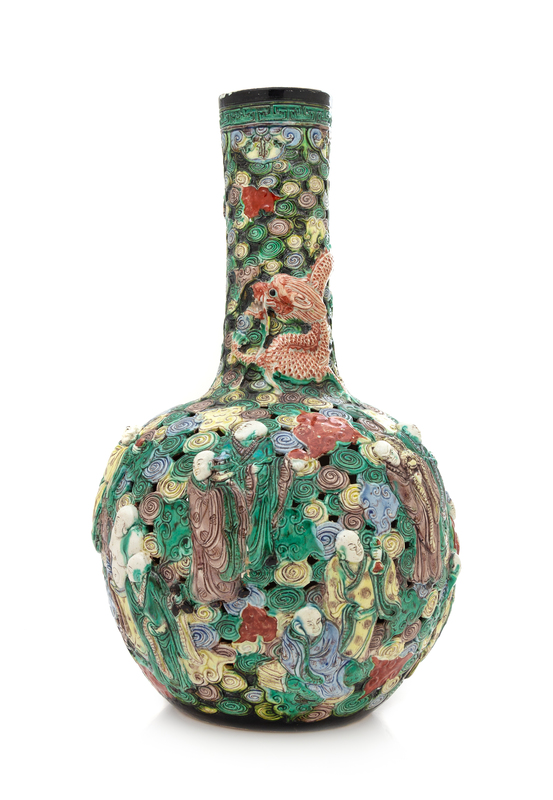 of globular form, with reticulated decoration showing various luohan figures amongst clouds underneath a sinuous dragon.
