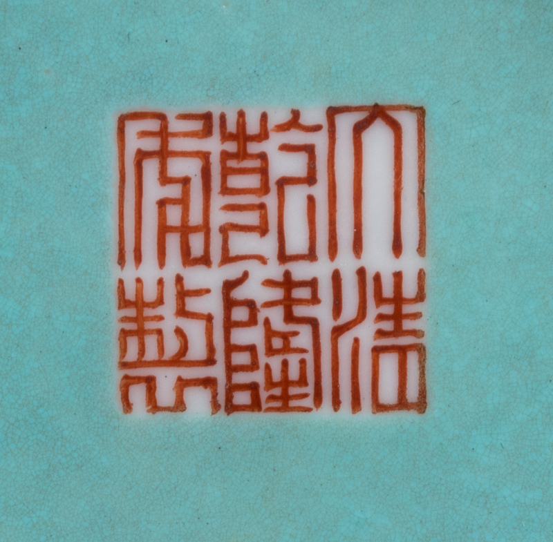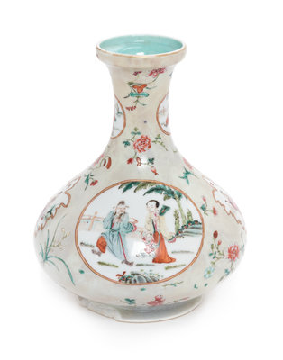 the pear shaped body raised on a splayed foot, having a recessed neck and a galleried mouth, the exterior painted with shaped panels showing figures in garden, interspersed with floral sprigs against a creamy white ground, the interior and the underside glazed turquoise, the base bearing an apocryphal Qianlong four-character iron red mark.