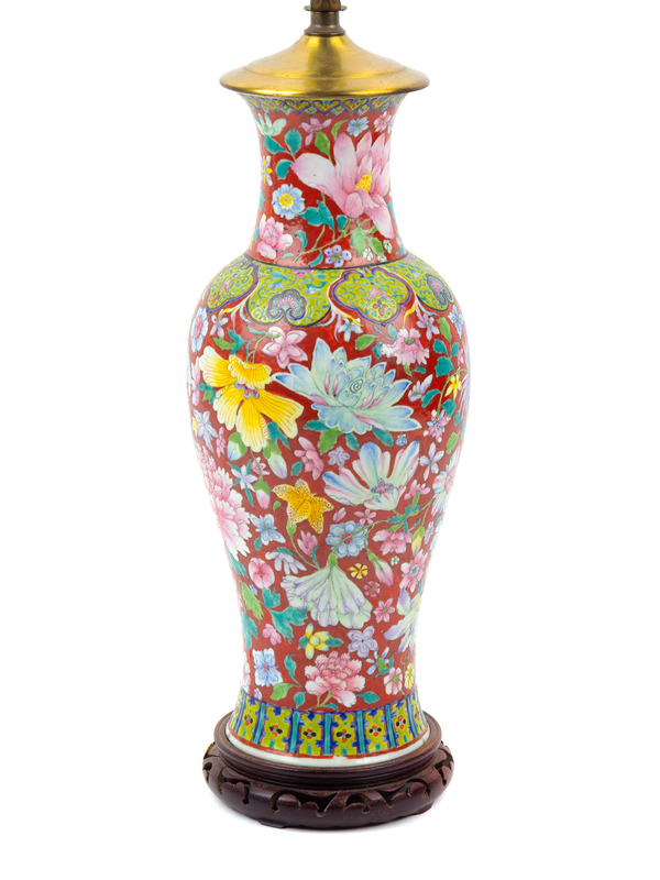 mounted as a lamp, richly enameled with lotus and chrysanthemums on a red ground.