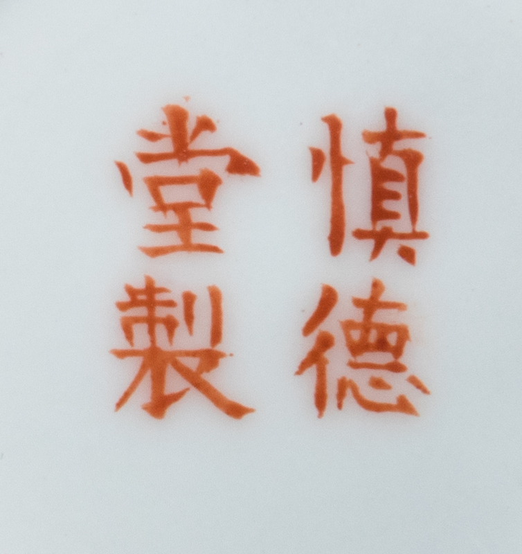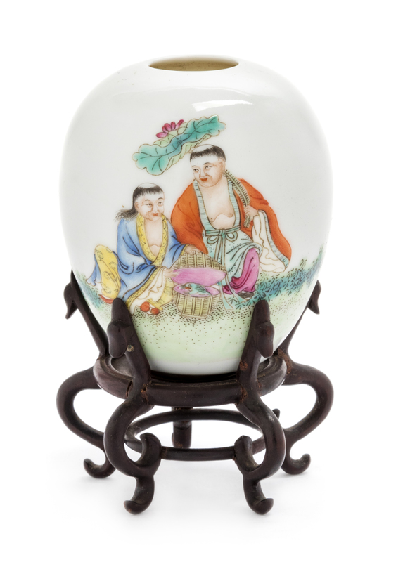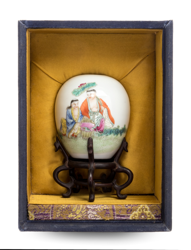 of ovoid form, finely painted to the front depicting two immortals, Hehe Erxian, one carring a large lotus sprig and the other bearing a box, the underside bearing a 'Shende tang zhi' four-character iron red mark, together with original box.