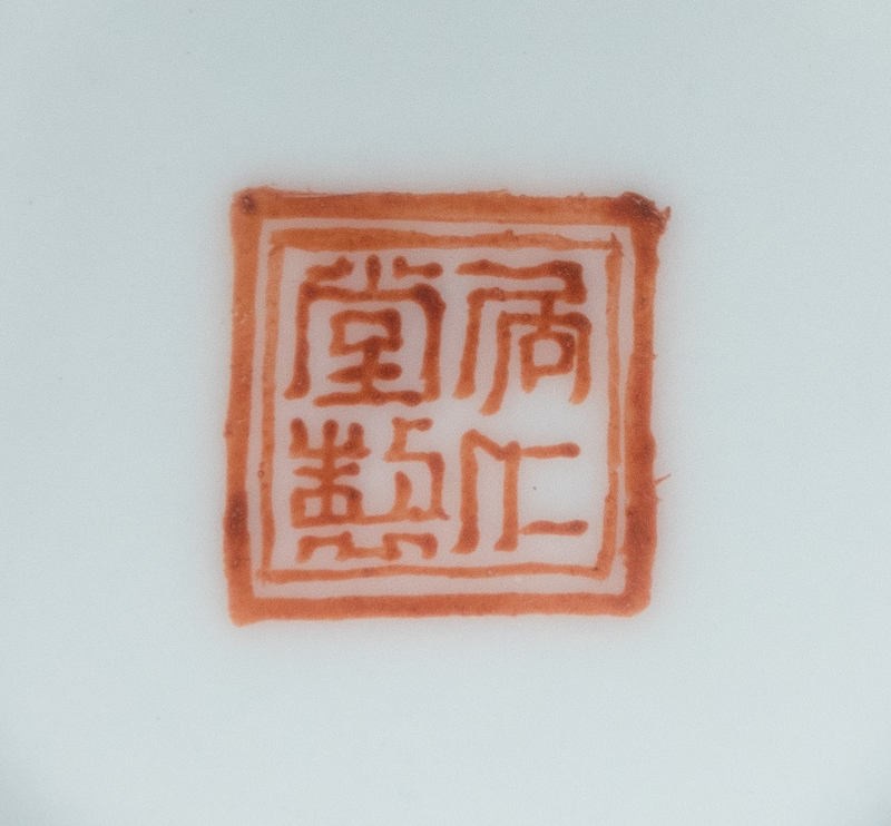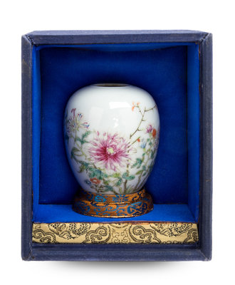 finely painted with various floral blossoms, the underside bearing a 'Juren tang zhi' four-character iron red seal mark within a double square, together with the original box.