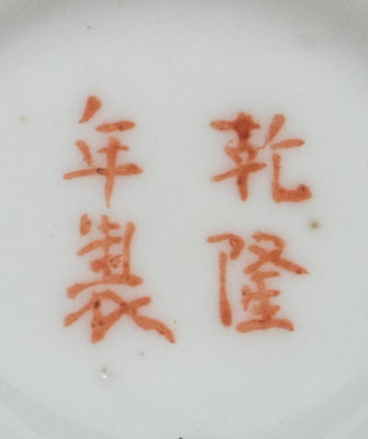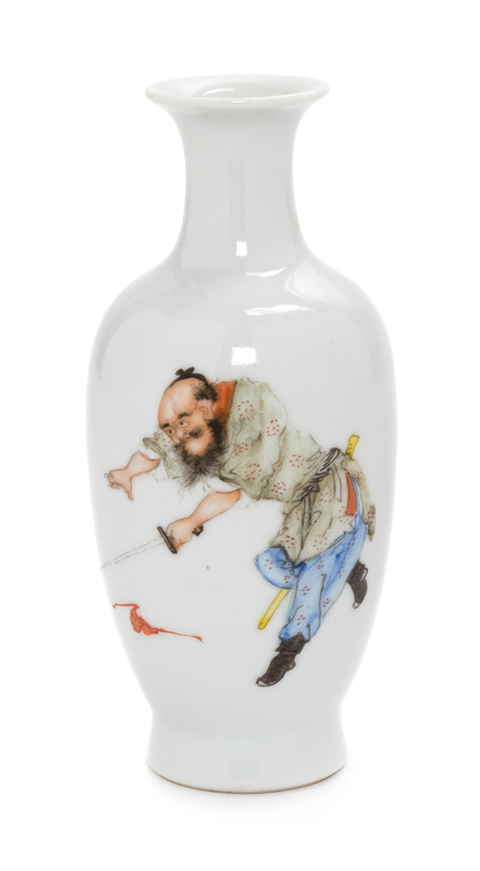 the baluster body finely painted to show a warrior figure carrying a sword, a bat in flight besides the figure, the underside bearing an apocryphal Qianlong four-character iron red mark.