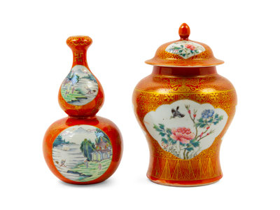 Two Chinese Coral Ground Gilt Decorated and Famille Rose Porcelain Articles