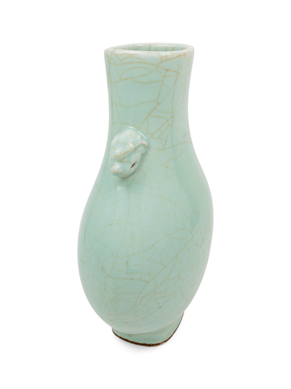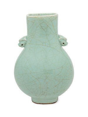 the pear-shaped hu vessel of rectangular section with a round belly rising from a short straight foot to a tapered neck, flanked with two beast form handles, applied overall with a cracked pale grey caesious colored glaze.