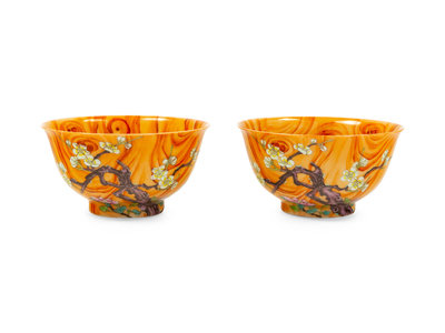 A Pair of Chinese Famille Rose and Faux Bois Porcelain Bowls Diameter 5 inches.