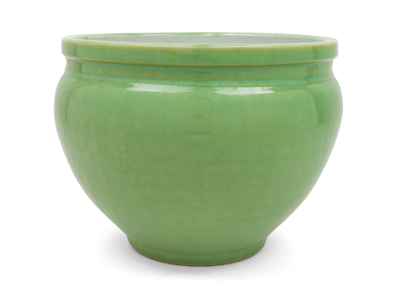the first a famille rose basin, the second a cachepot dcorated with peonies and birds resting on branches; the third a longquan celadon glazed jar.