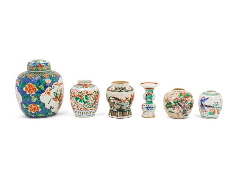 the first a power blue ground covered jar decorated with flori-form panels inclosing flowers; the second an iron-red and green enameled jar; the third a famille verte example painted with peonies and phoenixes; the forth a small iron-red and green enameled yen-yen vase; the fifth an crackle ground iron-red and green enameled 'figural group' jar; the sixth a small white ground jar painted with figures.