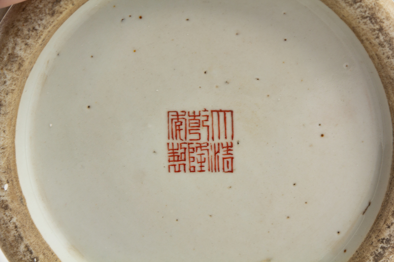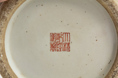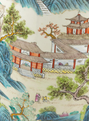 painted with scholars in a landscape of mountains and lakes, the base with a Qianlong six-character iron red seal mark.
