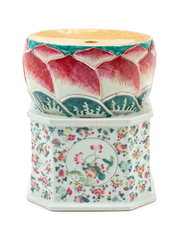 the octagonal base painted with floral sprigs, raising to a lotus bud-form top.