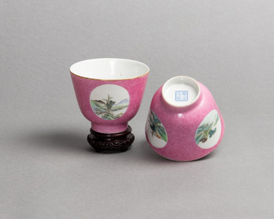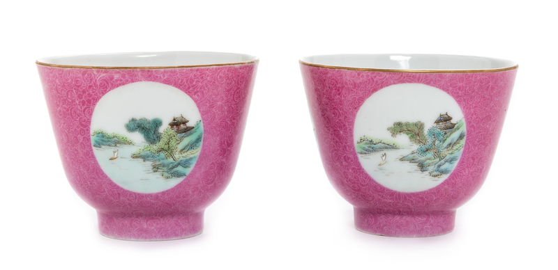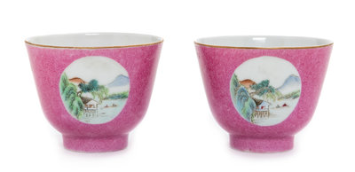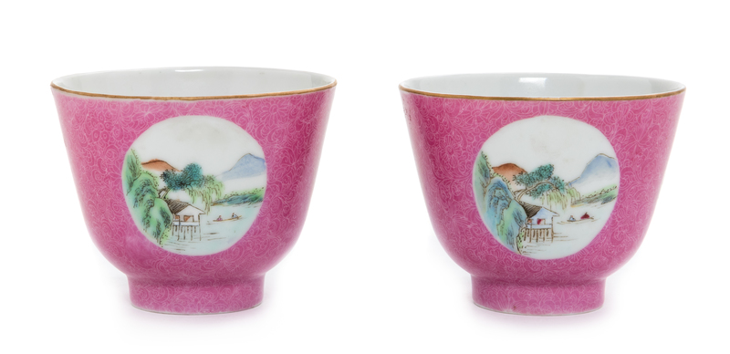 A Pair of Chinese Pink Enameled Sgrafitto Porcelain Wine Cups