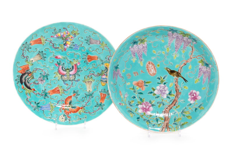 Two Chinese Turquoise Ground Famille Rose Porcelain Plates