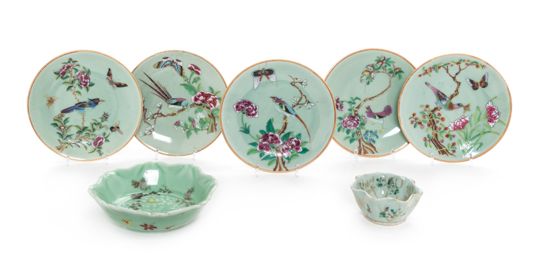 comprising six celadon ground plates depicting birds perched on flowering trees, one cachpot and one floriform cup.