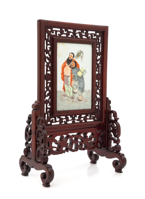 the porcelain plaque painted to show two immortals, Tie Guailie and Han Zhongli, set in a reticulated hardwood stand mounted as a table screen.
