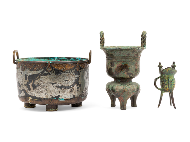 the first a tripod censer with silver inlay of dragons to the exterior; the second a bronze yan; the third a bronze jue.