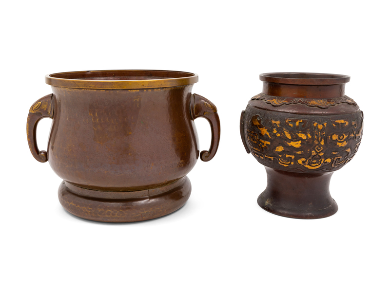 the first of compressed globular form with the neck flares slightly to the everted rim, flanked by a pair of elephant form handles; the second of globular form rising from a tall foot to a short straight neck, cast to the body with taotie masks.