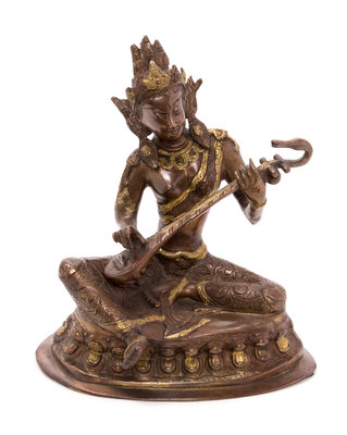 the figure depicted seated at ease upon a waisted lotus base, playing a musical instrument.