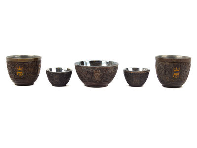 Five Chinese Silver Inlaid Coconut Shell Wine Cups