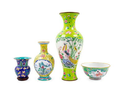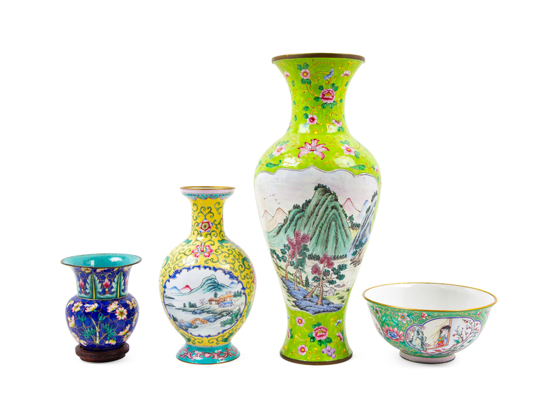 the first a bowl, decorated with shaped reserves enclosing figures, the second a balster vase painted with panels showing landscapes, the third a blue ground vase, the forth with pear-shaped body rising from a slightly splayed foot to a waisted neck and flared rim, painted with medallions enclosing landscapes against a yellow ground with lotus scrolls.