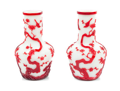 A Pair of Chinese Red Overlay White Glass Mallet Vases