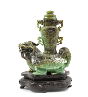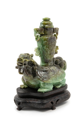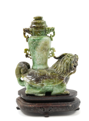 depicting the mythical beast, bixi, carrying a covered vase on its back.