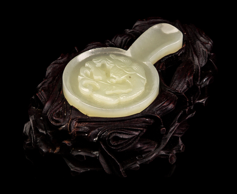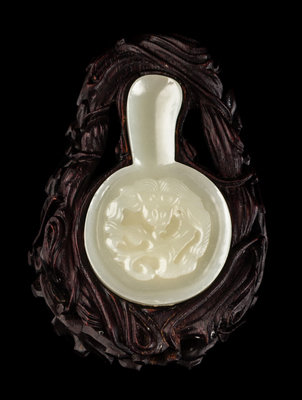of an even colored stone, carved in the shape of a fan, the front decorated with a high relief carved sinuous dragon, raised on a fitted hardwood stand finely carved with leafy branches.