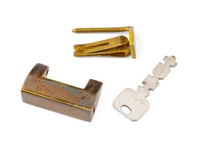with metalware hinges, plates, pulls and a intricately worked lock.