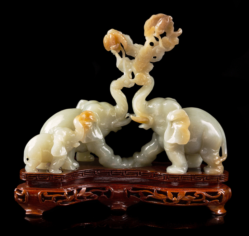 the first a celadon and russet jade figural group of three elephants, the second an apple green and russet jadeite vessel.